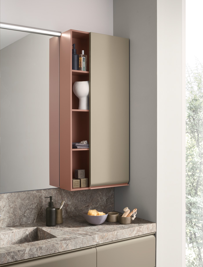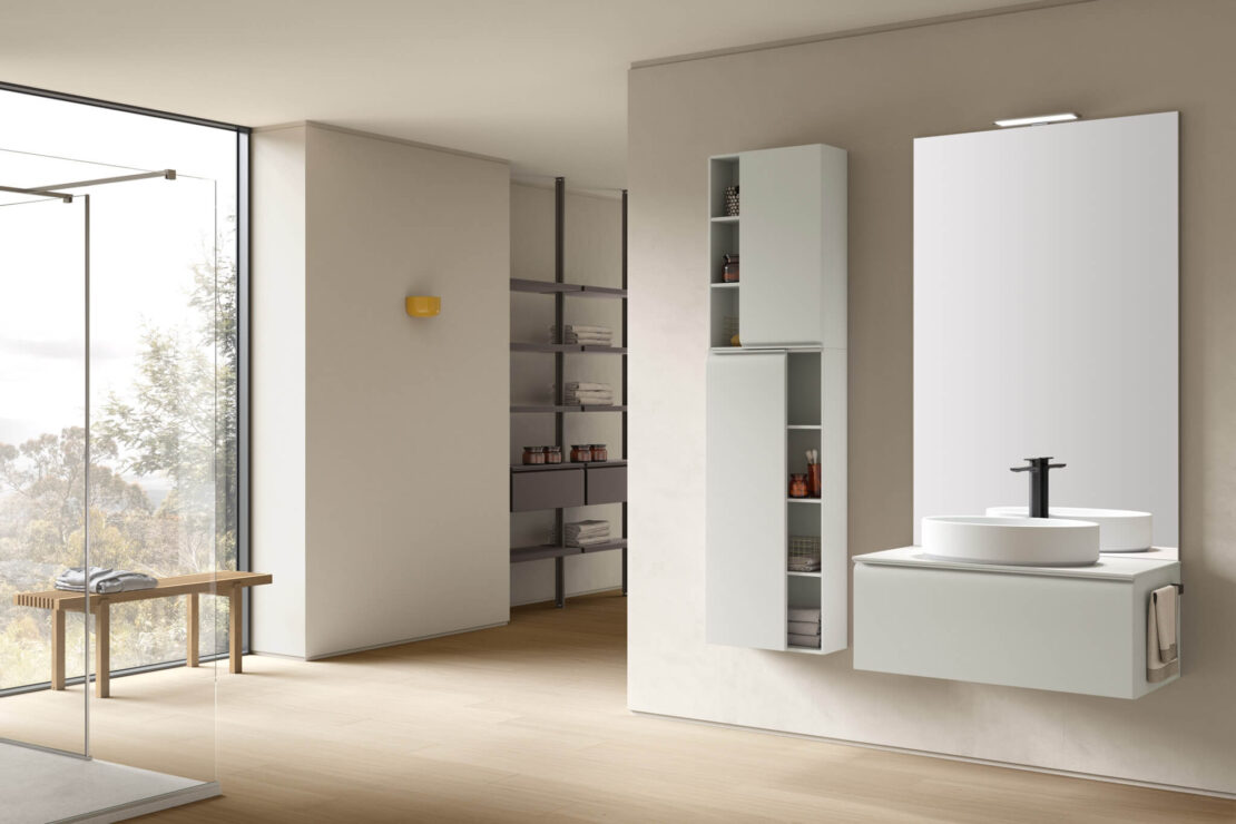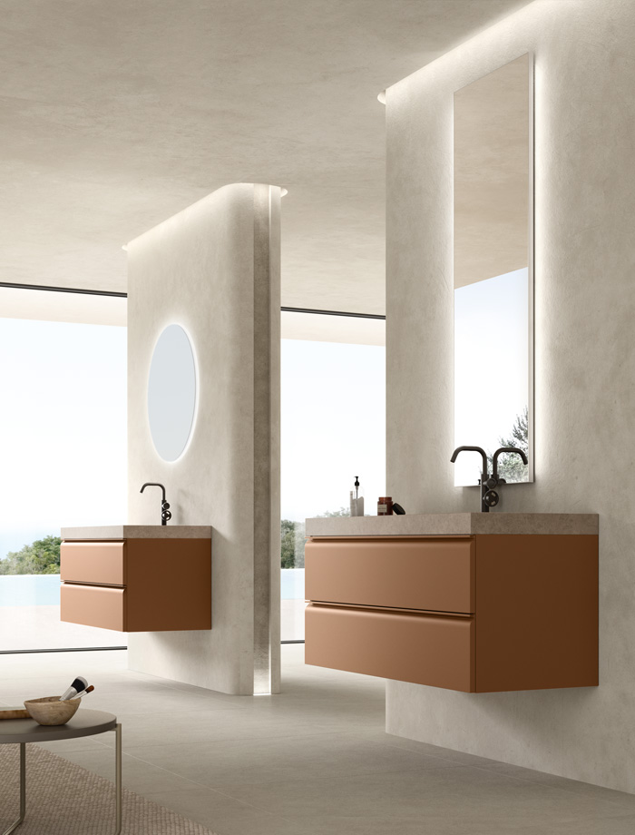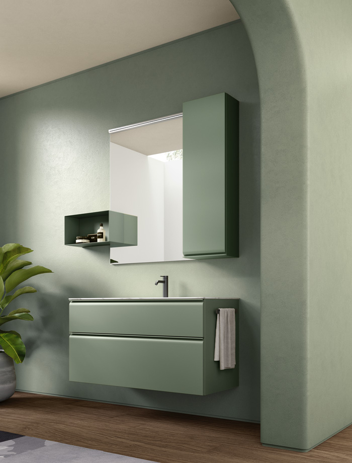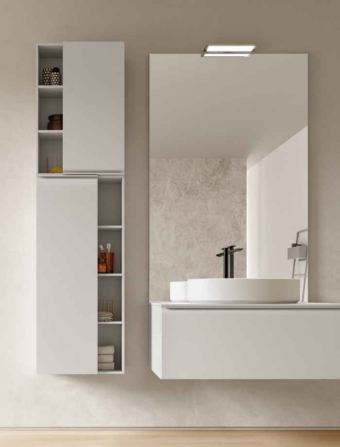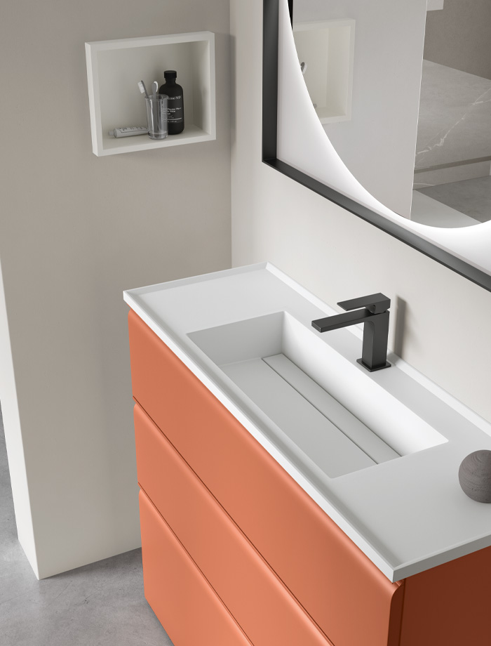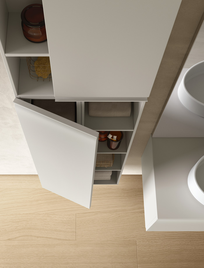 Une collection de meubles de salle de bain design qui met en valeur les lignes épurées grâce à des détails arrondis et fonctionnels. Virgola se distingue par sa porte façonnée élégamment reliée à la poignée à gorge intégrée, qui suit parfaitement le profil. Un design fluide qui exprime une grande attention à l’esthétique mais aussi à l’ergonomie.