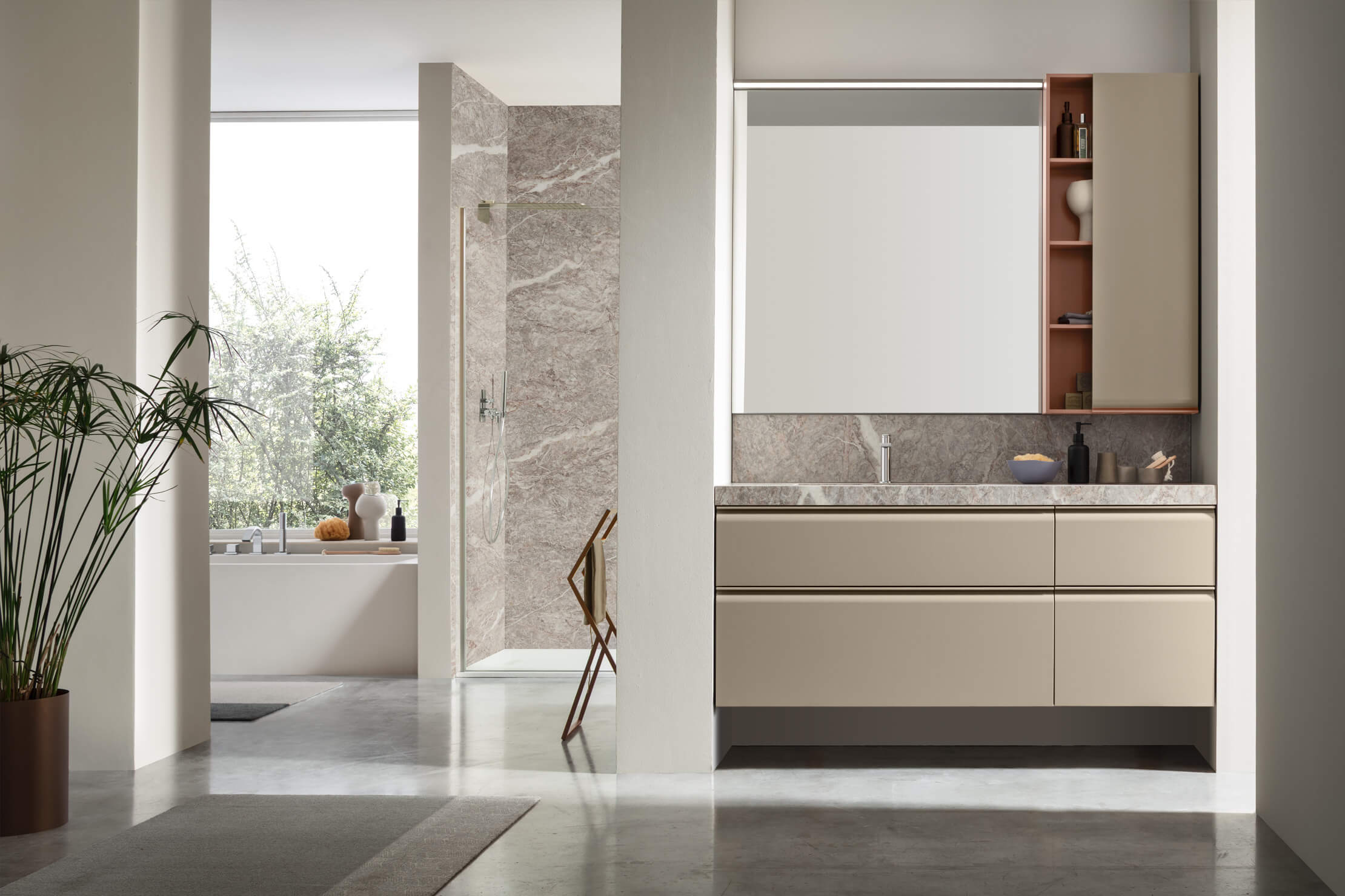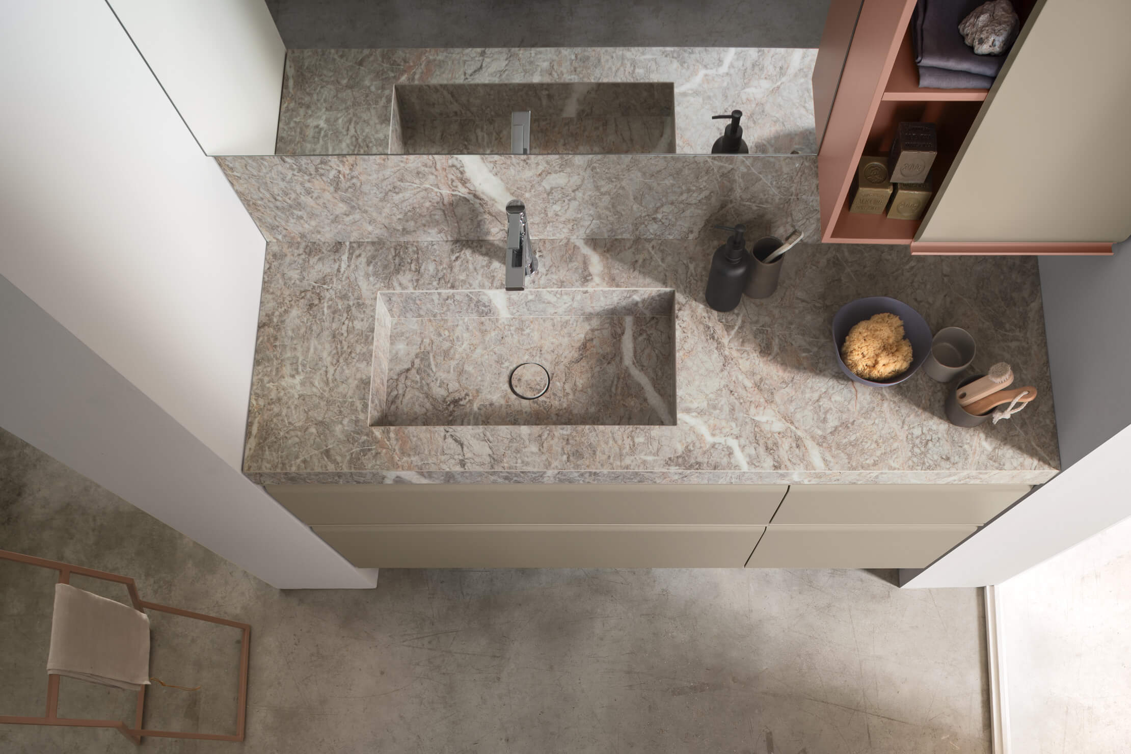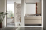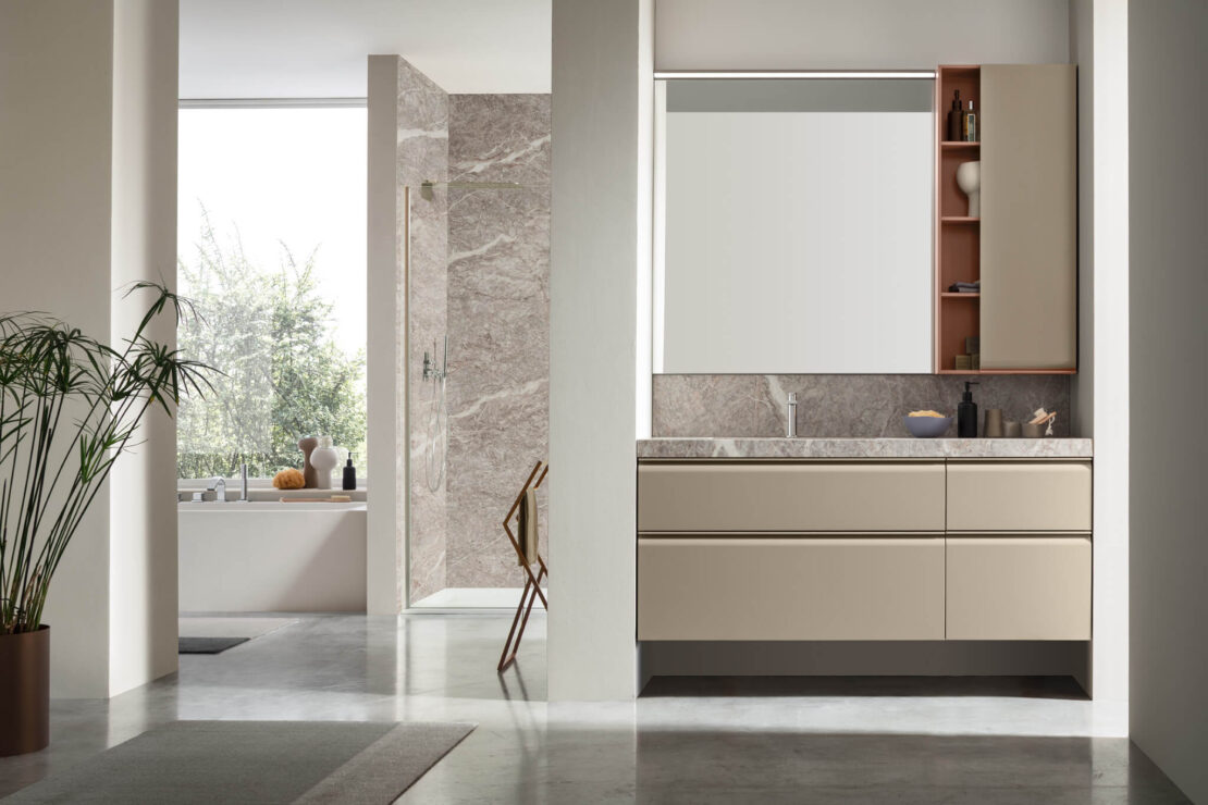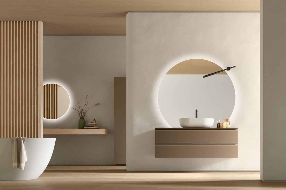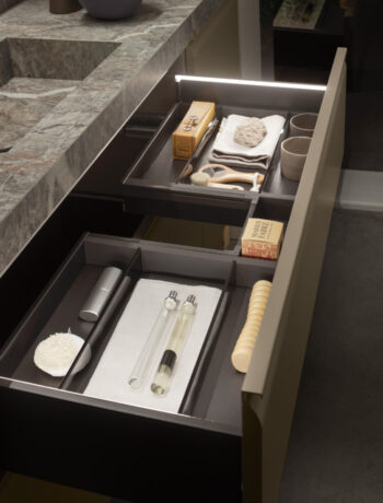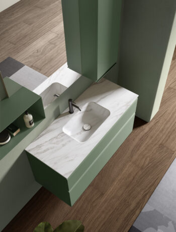 Une collection de meubles de salle de bain design qui met en valeur les lignes épurées grâce à des détails arrondis et fonctionnels. Virgola se distingue par sa porte façonnée élégamment reliée à la poignée à gorge intégrée, qui suit parfaitement le profil. Un design fluide qui exprime une grande attention à l’esthétique mais aussi à l’ergonomie.