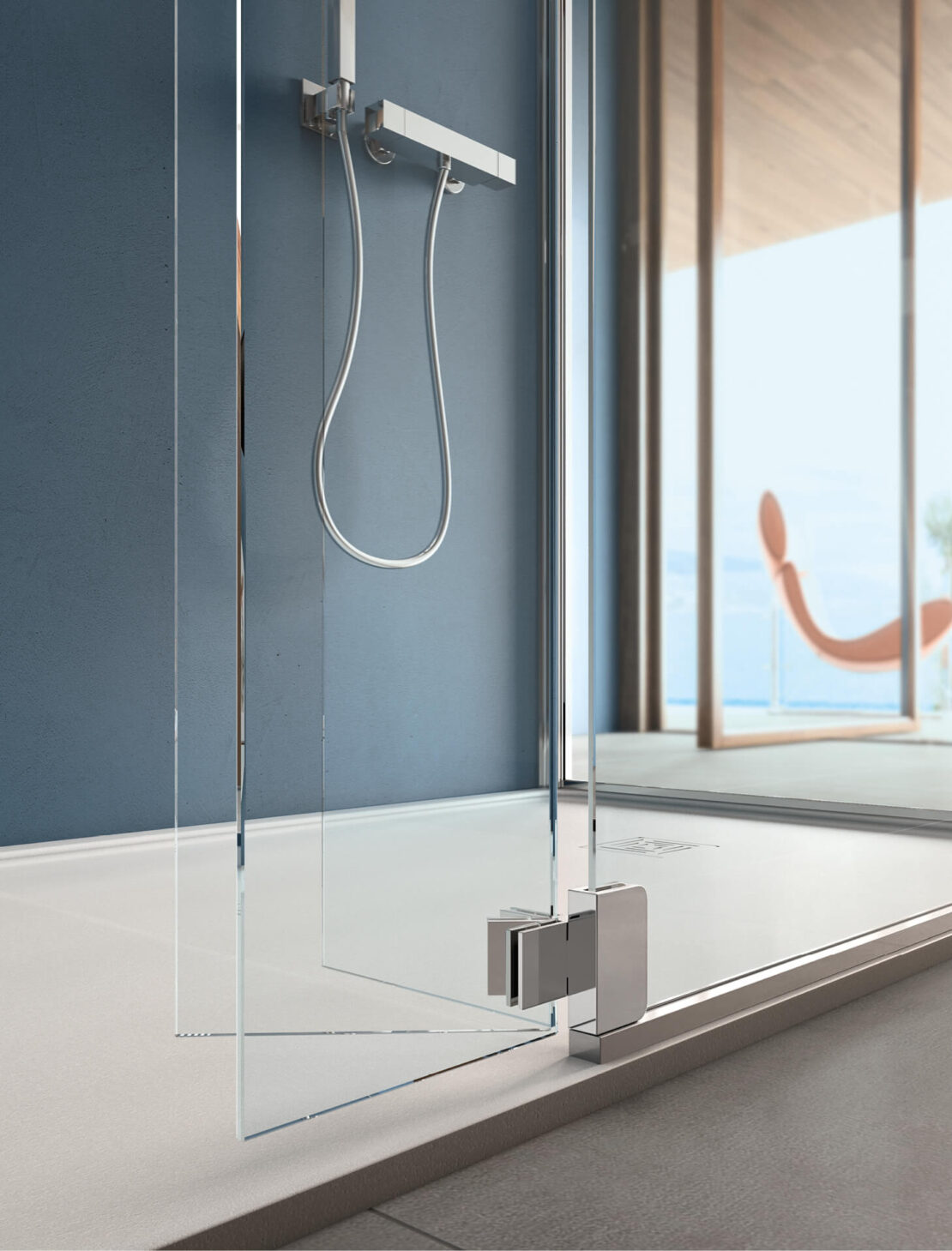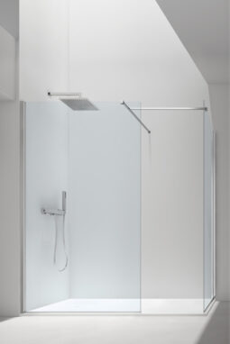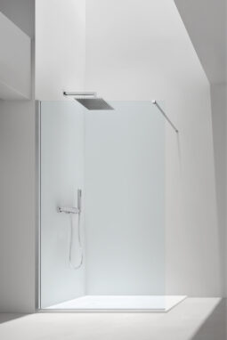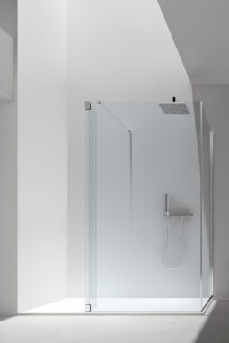 Le soluzioni di sostegno per il box doccia walk-in uniscono stabilità strutturale ed essenzialità formale.