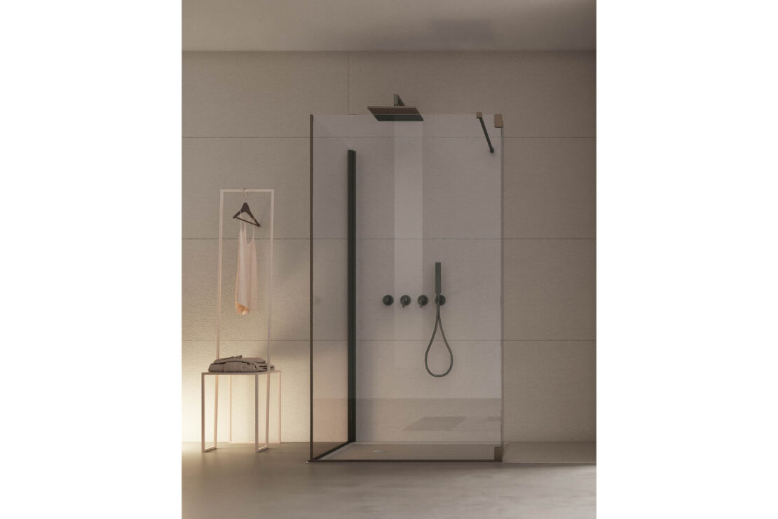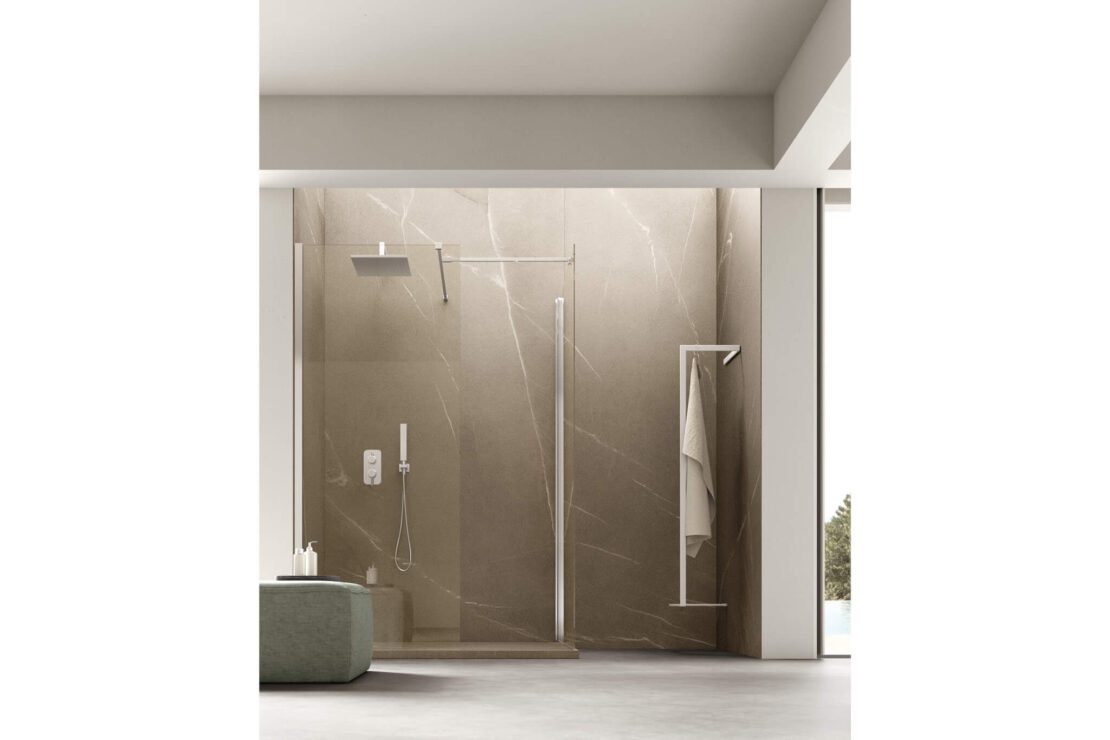 L’apertura libera valorizza le pareti doccia e le finiture, permettendo una maggiore
