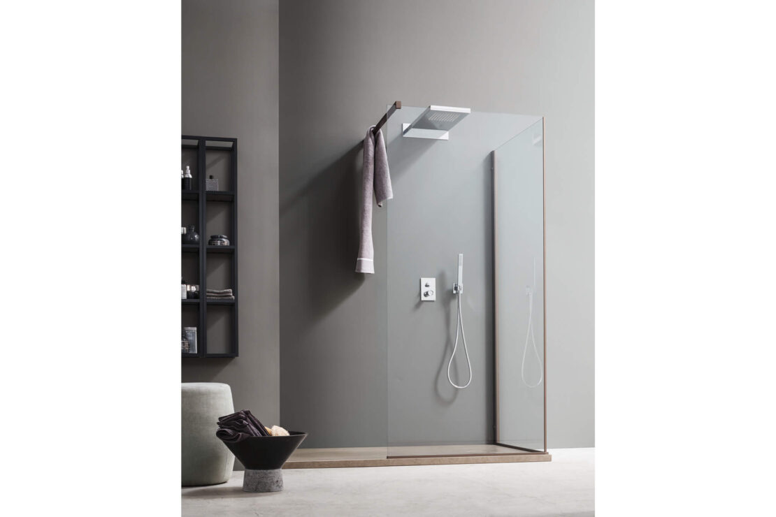 Le soluzioni di sostegno per il box doccia walk-in uniscono stabilità strutturale ed essenzialità formale.